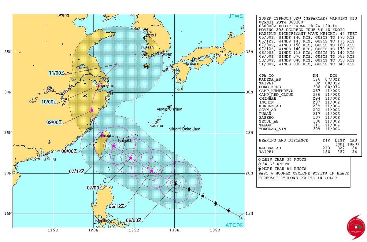 Theo CWB- Cục dự báo thời tiết Đài Loan. siêu bão Nepartak đang di chuyển theo hướng tây-tây bắc với vận tốc 20 đến 25km/giờ, sức gió có lúc lên đến 245km/giờ và đổ bộ vào Đài Loan vào sáng hôm nay ngày 07/07/2016.